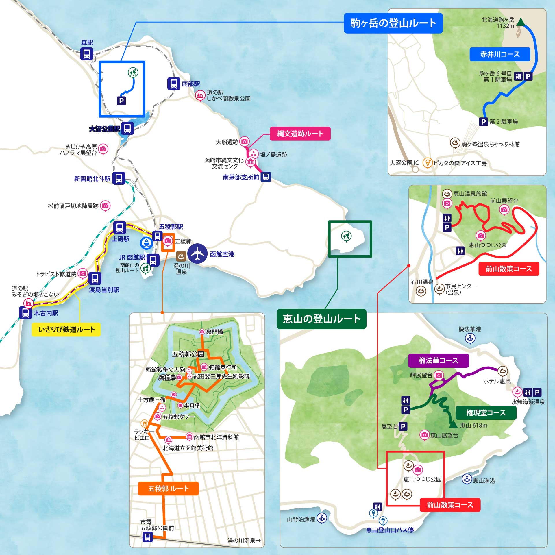 亀田半島の東端、標高618mの活火山です。エゾヤマツヅジが咲き乱れる「つつじの里」。標高300mの「火口原駐車場」まで車で行ける。