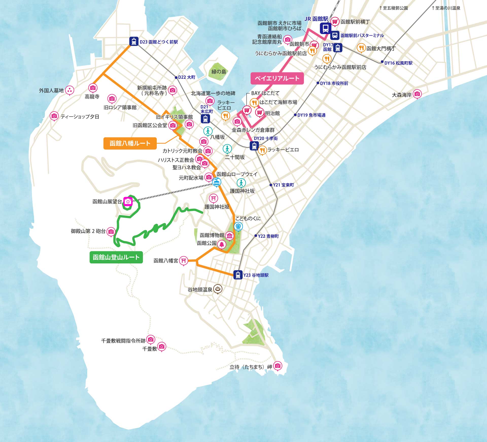 ベイエリアは「ラッピ、ハセスト、カリベビ、函館塩ラーメン、海鮮丼、函館スイーツ」のグルメルートであり、また、「明治館、金森赤レンガ倉庫」などのショッピングルートです。
