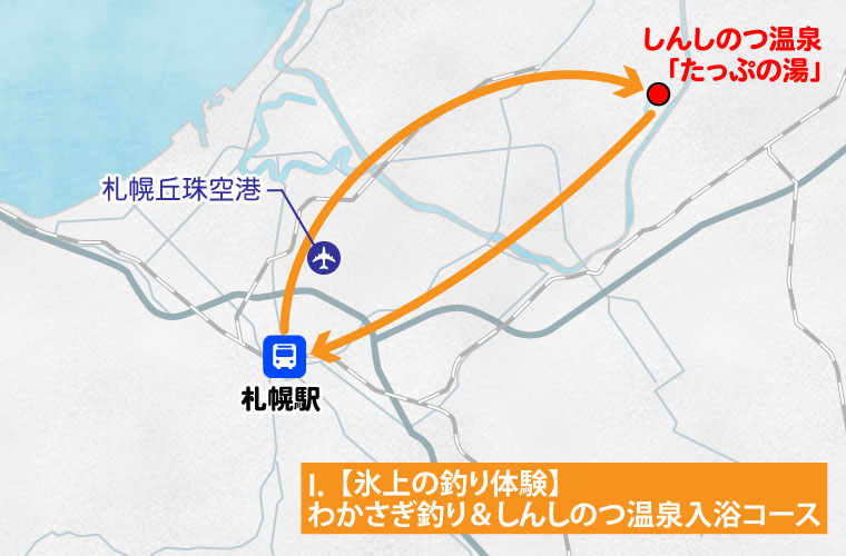 | 12:48~16:00 | しんしのつ温泉 たっぷの湯 昼食(12:50~13:30) ※①わかさぎ釣り体験(13:30~16:00) ※②入浴(釣り体験後~16:00) |