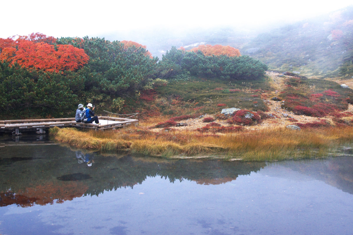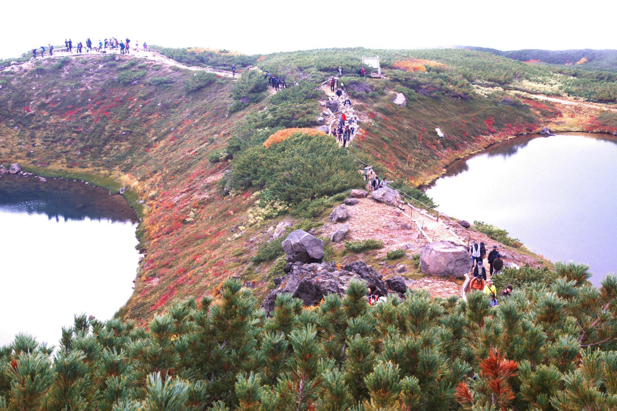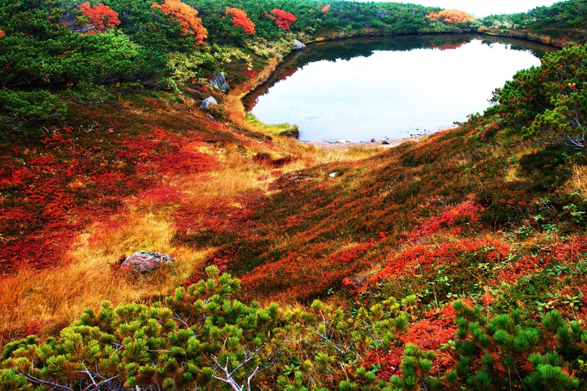 旭岳の紅葉見学はとても簡単です。旭川駅前からバスで旭岳山麓駅まで行き、ロープウェイで約 10 分。標高 1600m の姿見駅を出ると目の前に紅葉が広がります。そして、1 周約 1 時間ほど、距離にして1.7km の「姿見の池周遊コース」を歩きましょう。ウラジロナナカマド、ダケカンバの紅葉を初心者でも楽しむことができます。
