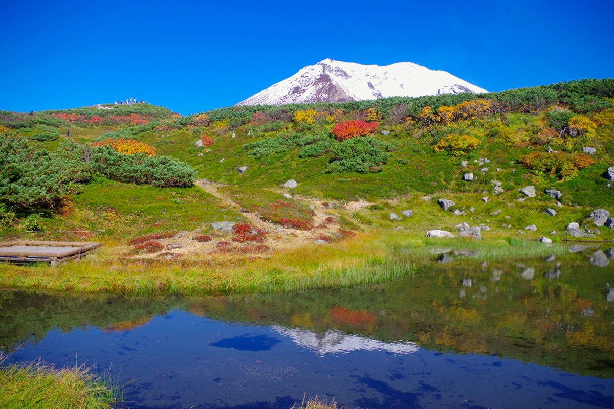 なんと 8 月下旬から色づき始め、9月中旬頃には日本で一番早い最初の紅葉が見られることで人気の旭岳。日本で一番広く(226,764ha)、そして日本で最初に指定された国立公園(1934 年 12 月 4 日)である大雪山国立公園の山々の中で、最も高い、秀峰旭岳(2291m)です。