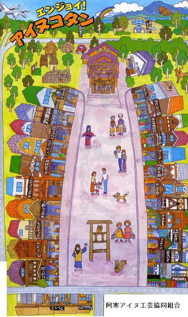 やってきました。アイヌコタン。阿寒湖には面していませんね。集落は意外とこじんまりしています。入口には守り神であるフクロウの巨大な木彫りアーチがあります。30軒ほどのお土産店や飲食店が向かいあって建っています。中央にはトーテムポールがあり、ポールに刻んでいる形の一つ一つが阿寒に住むアイヌ人の生活と深い関わりのある神の象徴(ヒグマ、クジラ、鹿、フクロウなど)であることがわかります。